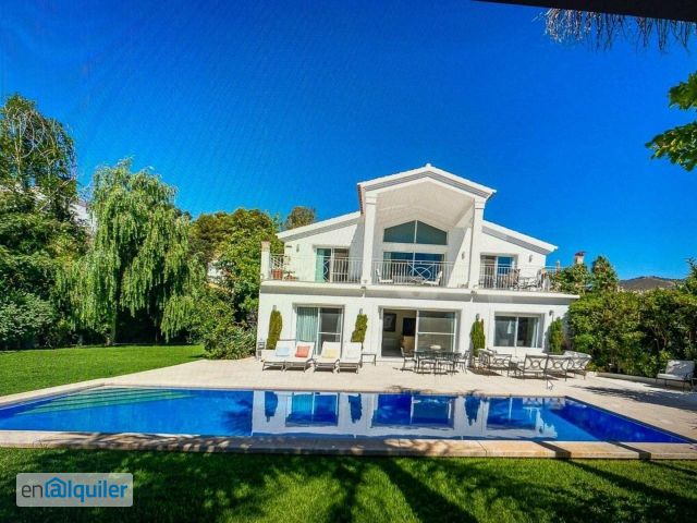 MARAVILLOSA VILLA INDEPENDIENTE EN ELVIRIA - MARBELLA Situada en la exclusiva zona de Elviria, ubicada a pocos minutos del Club de Golf Santa María, las playas y los mejores servicios de la zona, combina privacidad y comodidad con un acceso inmejorable a la A7. Con una parcela de 1.400 m2, la propiedad cuenta con un hermoso jardín lleno de árboles, una gran piscina y una acogedora zona de barbacoa. Su interior destaca por sus amplios espacios, como la luminosa sala de estar con chimenea y acceso directo a la terraza, perfecta para disfrutar del exterior. La cocina, moderna y totalmente equipada, ofrece gran capacidad de almacenamiento. La villa recientemente amueblada dispone de 5 dormitorios y 4 baños, distribuidos en tres niveles. En la planta principal se encuentran dos dormitorios, incluido el principal, con acceso a la terraza y baño en suite. La planta superior ofrece dos habitaciones versátiles con terraza y un baño compartido. En la planta inferior hay un quinto dormitorio, una amplia lavandería y un garaje con espacio para seis coches, que también cuenta con una cocina y un bar, ideal para organizar reuniones o eventos. Además, la propiedad ofrece estacionamiento exterior para varios vehículos y está equipada con un sistema de seguridad para garantizar tranquilidad y privacidad. Esta villa es una oportunidad única para disfrutar de un estilo de vida exclusivo en una de las zonas más deseadas de Marbella. No te pierdas esta oportunidad de vivir en una de las zonas más deseadas de Marbella. ¡Contáctanos para más información y para programar una visita! Precio: 6500?/mes Dos meses fianza Jardinero 300?/mes La propiedad requiere pagos por adelantado y demostración de solvencia