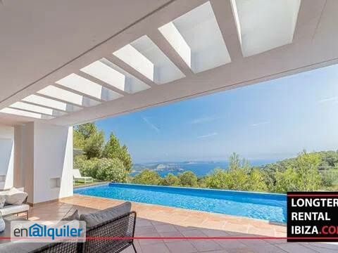 ANNUAL RENTAL - ES CUBELLS. Luxury villa in the private area of the prestigious area of Es Cubells. The villa in on one floor, has three bedrooms en-suite all with direct access to the terrace, a smaller fully equipped kitchen and a large living room with sliding doors and access to the large terrace. The terrace is covered and perfect for outdoors living. There is a large pool and incredible views on the sea of Es Cubels. The villa is accessible by a large drive way, and parking space for four cars. The land is fully excluded and with lots of privacy. This villa has a tourist license. ? Schedule a viewing with our agent.