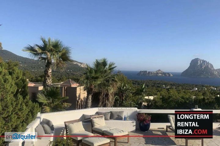 ANNUAL RENTAL - ES VEDRA. The best sea-view of the legendary Es Vedra magic symbol of Ibiza, the most romantic sky-bed king size on the huge terrace to enjoy sunset & stars show. All the villa had been renewed just now. You will find on the main house living room a NEW - Salvador Dali art-mosaic at the fireplace. There?s a concierge service 24/7. We find a designed pool with jacuzzi & water slide to enjoy with friends and family looking to the breath-taking sea view and es vedra. The Private Area The house is divided in 2 floors, On the first floor we find a kitchen used as support for when you are doing a barbecue with friends, we find some SMEG home appliances, the laundry room, a spacious living room with fireplace and views to es vedra that can be enjoyed on the different lounges on the terrace. There?s three bedrooms and two bathrooms with bath, one of the bedrooms have a direct access and view to es vedra. On the ground floor we find a spacious living room with fireplace with Salvador Dali mosaic decoration, fully furnished open kitchen with a pizza oven. The living room has a beautiful dining table that fits six people with the views to the sea and garden. Three doble bedrooms and one single bedroom with two bathrooms. The villa has air conditioning hot and cold, also equipped with a sonos sound system and alarm. On the other side of the pool we find a staff apartment with two bedrooms, bathroom and kitchen. The Private Lounge - 1 st floor - large private terrace 80 msq with 2 covered lounge and Sky Stars Bed - 2 floor - covered terrace diner- lunch The shared Lounge - Large deck terrace ( 100 msq) lounge next to Buddha & Es Vedra view - Bali Lounge - ( 50 msq) ideal for massage - Stylish Pool with slide and Jacuzzi - Sunset Lounge The perfect villa to enjoy with family and friends and feel the magic of the emblematic Es Vedra. Schedule your viewing!
