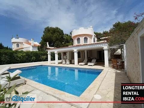 ANNUAL RENTAL - SANTA EULALIA. This beautiful two-storey detached villa is located in the urbanization of cala llenya, La Joya. It has 167m2 built on a plot of 1000 m2 with a huge and well kept garden in the front that gives privacy to the house and provides a beautiful landscape. The whole house is decorated and furnished with elements of the highest quality. In the outdoor areas we find a large swimming pool with shower and sun loungers area, a dedicated barbecue area with space for cooking and a round support table. The covered terrace has two accesses to the house and is furnished with comfortable sofas and a table for 8 people. The laundry and storage room is located at the back of the house with access from the outside. On the ground floor we have a large hall that leads to a fully equipped kitchen and design, a very spacious and bright dining room from which we can access the courtyard and the living room. We also find on this floor a guest bathroom with shower and two double bedrooms ensuited with fitted wardrobes. On the upper floor we can access through the stairs or through the private elevator, where we find the master bedroom with its own bathroom and access to a private balcony equipped with jacuzzi and a chill out area. Rental can be for the season only. Pool and garden maintenance is included, feel free to schedule a visit with your agent.