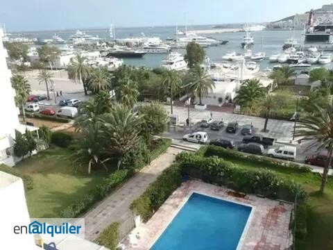 TEMPORADA DE VERANO! Se alquila desde 1 de Mayo hasta 4 de Octubre. En Marina Botafoch, cerca de Gran Hotel, piso de 2 habitaciones matrimonial, salon luminoso, cocina toda equipada, 2 banos (uno en suite con bañera) terraza vista mar y piscina comunitaria. Precio alquiler 19.000? (los gastos de luz y internet se pagan a parte el agua estas incluida). Mas fianza y comisión de la agencia. Se pide pago por adelantados.