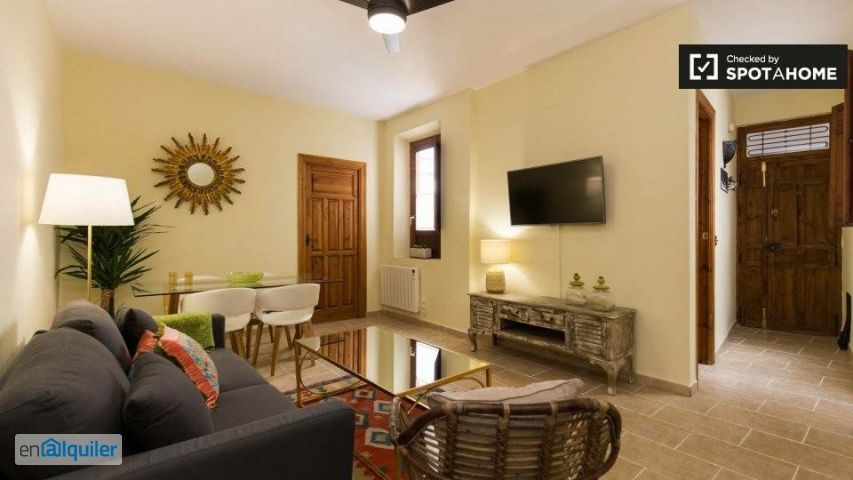 Un hermoso apartamento de 2 dormitorios con balcón está disponible para alquilar en Realejo. El apartamento tiene una elegante sala de estar, donde puede relajarse en el cómodo sofá al final de un largo día y ver la televisión, o sentarse con su familia, compañeros de piso o amigos a una deliciosa comida en la gran mesa de comedor. La cocina tiene todo lo esencial, incluido un horno, una estufa de 4 quemadores, un microondas y un gran frigorífico con congelador. Ambas habitaciones tienen mucha luz natural, y cada una está bien amueblada con dos camas individuales o una cama doble grande y un montón de espacio de almacenamiento para todas sus cosas. El baño es lujoso, con una enorme bañera, perfecta para baños de burbujas. Vivirás en Realejo, uno de los barrios más céntricos, históricos y mejor conectados de Granada. Alrededor de la zona, lo tendrá todo: restaurantes, cafeterías, monumentos, museos, bares de tapas y tiendas en prácticamente cada rincón. Si estabas buscando una casa central en Granada, ¡la has encontrado!