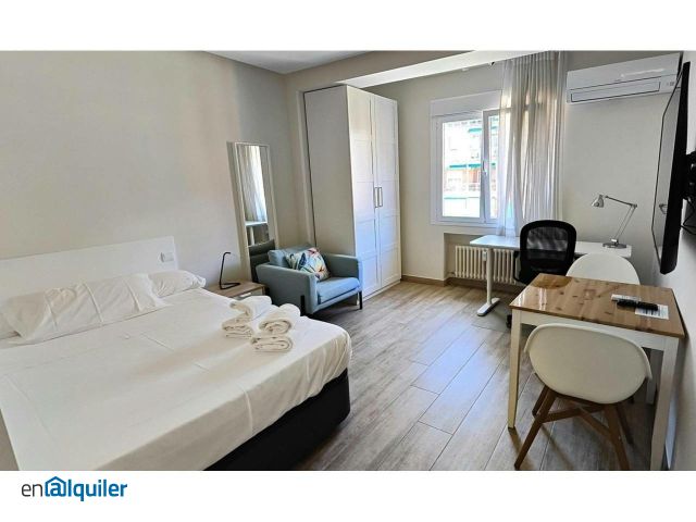 iRent Madrid ofrece estudio en Paseo de la Castellana entre entre Plaza Castilla y las Cuatro Torres y el Instituto de Empresa, apto para estancias temporales menores de un año. Ideal para estudiantes del IE Instituto de Empresa. El estudio cuenta con cama doble de 135cm con canapé, escritorio de trabajo/estudio con silla, mesilla de noche, televisión de pantalla plaza, amplio armario de suelo a techo y doble puerta y amplio ventanal con mucha luz natural y vistas a Paseo de Castellana. Cuenta con aire acondicionado frío/calor y con calefacción central incluida en el precio. Cocina totalmente equipada (nevera, horno microondas, vitrocerámica de inducción, campana extractora de humos..) y con todos los utensilios necesarios. Baño completo con plato de ducha. El estudio dispone de lavadora/secadora en un cuarto común y a compartir con otros 4 estudios en la misma planta. Situado en Paseo de la Castellana, junto a la estación de Charmartín (Metro Líneas 1 y 10, Cercanías Renfe C1, C2, C3, C4, C5, C6, C8 y C10, así como trenes regionales, nacionales y AVE, y numerosos autobuses). Todos los suministros (electricidad, calefación, agua y Wifi Internet) incluidos por 100? al mes. El estudio se entrega con ropa de cama (sábanas y edredón) y toallas. Se pide un mes de fianza + mes de agencia (más iva) ajustable en base a la duración de la estancia.