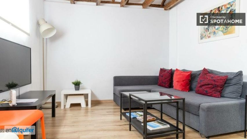 Descubra este apartamento de 1 dormitorio en alquiler en Embajadores, Madrid. Este apartamento interior cuenta con aire acondicionado y calefacción individuales, lo que garantiza la comodidad de sus inquilinos. Totalmente amueblado para su comodidad, incluye cocina equipada y lavadora. Incluye wifi y TV. Se ofrece servicio de limpieza periódica por un suplemento. No se permite fumar ni se admiten mascotas. Embajadores, un vibrante barrio de Madrid, ofrece numerosos lugares de interés cultural. Entre los puntos de interés cercanos se incluyen la calle de Lavapiés, el Mural del Bosque Encantado y la Plaza de Arturo Barea, todos a poca distancia, lo que facilita el acceso a los lugares de interés y entretenimiento locales.