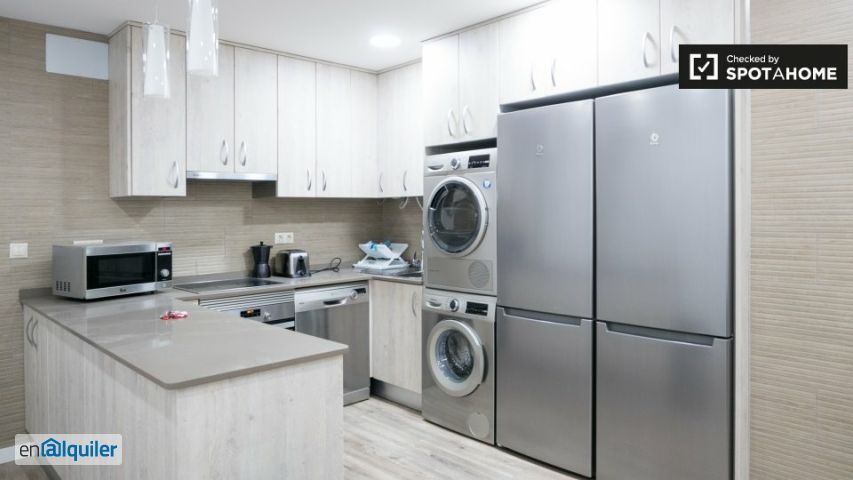 Este apartamento de 5 dormitorios, completamente amueblado y ubicado en el vibrante barrio madrileño de Ríos Rosas, ofrece un espacio amplio con comodidades modernas. El apartamento incluye aire acondicionado individual, cocina totalmente equipada con horno y lavavajillas, lavadora y secadora privadas, y un interior acogedor. El edificio cuenta con ascensor para mayor comodidad y portero para mayor seguridad. Tenga en cuenta que no hay internet disponible y que no se permiten mascotas ni fumar. Los suministros como electricidad, agua, gas y calefacción se pagan aparte al propietario. Ríos Rosas es una zona animada con una rica oferta cultural y una excelente conectividad. Entre las atracciones cercanas se incluyen la Apisonadora Antigua y la Aplanadora Pequeña, a pocos pasos. También encontrará otros lugares emblemáticos como el Compactador y la Mano de Botero. El encanto del barrio se complementa con sus edificios tradicionales y sus vibrantes calles, lo que lo convierte en un lugar maravilloso para explorar y disfrutar de su estancia en Madrid.