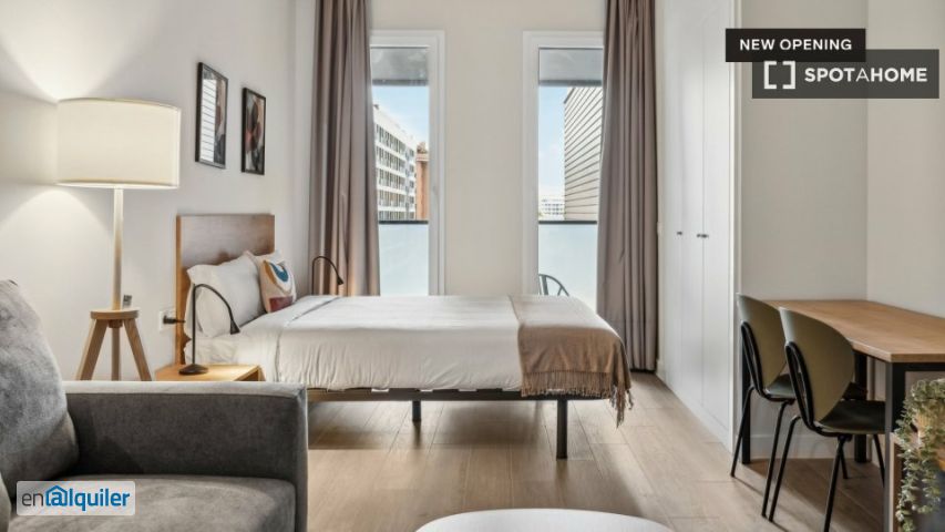 Con elegantes estudios y apartamentos de 1 y 2 dormitorios, este moderno edificio es la solución ideal para disfrutar de estancias flexibles en Madrid. Ubicado en el Ensanche de Vallecas, este alojamiento ofrece un estilo de vida integrado que se adapta a diferentes estilos de vida, incluyendo espacios completamente amueblados y servicios de primera clase. Los residentes pueden disfrutar de un momento de relax en la terraza y la piscina, ponerse en forma en el gimnasio o disfrutar de una noche de cine en la sala de cine. El edificio también incluye espacios de coworking y salas de reuniones, ideales para la productividad y la concentración, así como salas comunes y zonas ajardinadas exteriores. Disfrute de la máxima privacidad y comodidad en su propio estudio. Este espacio, totalmente equipado y amueblado, incluye una elegante sala de estar para relajarse y desconectar, una pequeña cocina para preparar sus platos favoritos y un baño privado. Planta: 4. ª