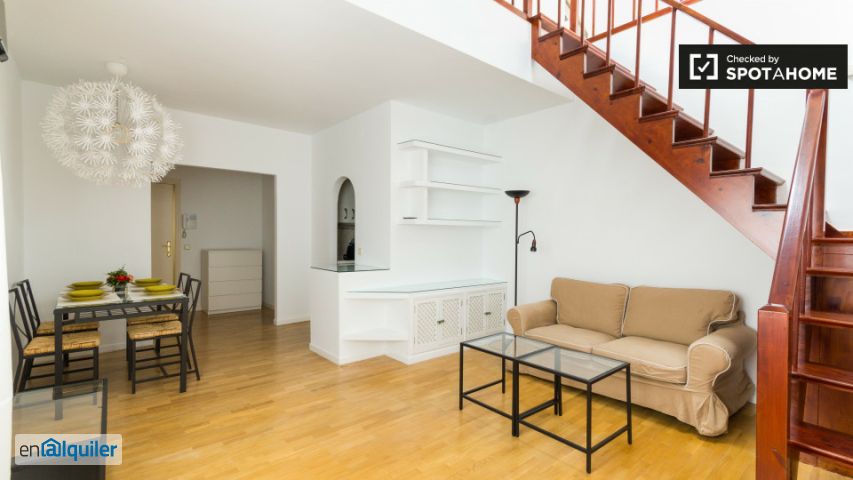 Fantástico dúplex en Sol. Genial dúplex ubicado en un ático, planta 4ª, en finca con ascensor. Cuentas con espaciosa sala de estar y comedor para compartir con amigos. En el piso superior tienes el dormitorio con cama matrimonial. Esta propiedad se encuentra en el centro de Madrid, con distintos teatros, tiendas y bares alrededor. Tiene la estación de metro Sevilla (línea 2) a 2 min caminando y la estación Sol (línea 1, 2 y 3) a 6 min. Al momento de desocupar la propiedad debe pagar 70 € para la limpieza. No está permitido fumar. Inglés Fantástico dúplex en Sol. Gran dúplex ubicado en un ático, 4To piso, en edificio con ascensor. Cuenta con una amplia sala de estar y comedor para compartir con amigos. En la planta superior está el dormitorio con una cama doble. Esta propiedad está ubicada en el centro de Madrid, con diferentes teatros, tiendas y bares alrededor. Cuenta con la estación de metro de Sevilla (línea 2) a 2 minutos a pie y la estación de Sol (líneas 1, 2 y 3) a 6 minutos. En el check out debes pagar 70 € por la limpieza. No está permitido fumar.