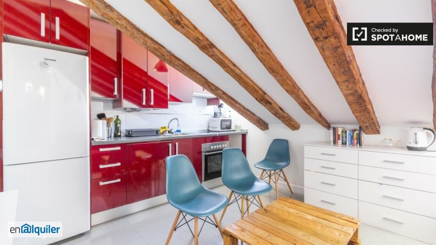 Este precioso apartamento de 1 dormitorio en Palacio ofrece un espacio totalmente amueblado y diseñado para la comodidad, con aire acondicionado individual y electrodomésticos como lavadora, horno y tv. Sin restricciones de inquilinos, profesionales, estudiantes, parejas y estudiantes Erasmus pueden hacer de esta propiedad su próximo hogar. Además, Spotahome ha revisado y verificado personalmente este anuncio para su tranquilidad. Ubicado en el encantador barrio de Palacio de Madrid, este apartamento está cerca de lugares emblemáticos como el Convento de la Latina, la Plaza del Cordón y la Plaza de la Paja, todos a poca distancia. Explore las atracciones culturales e históricas de los alrededores, lo que hace que esta ubicación sea ideal para sumergirse en el vibrante ambiente de la ciudad.