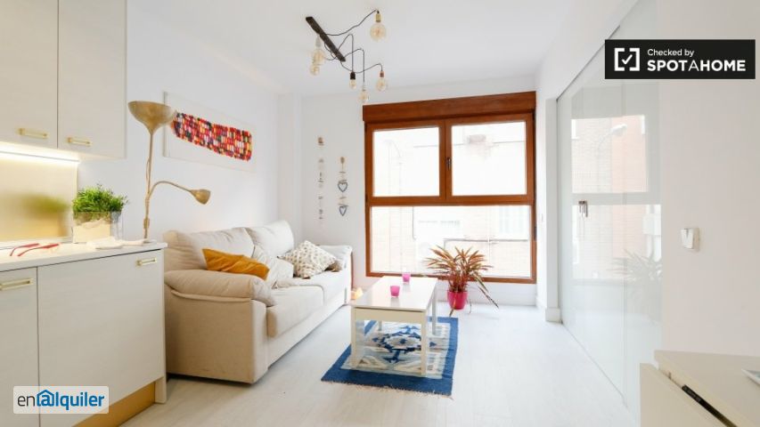 El lugar brillante y hermoso _porque necesitarás tus gafas de sol_ ¿me gustará aquí? Depende. ¿estás buscando la casa más luminosa de Madrid? Entonces echa un vistazo a este precioso apartamento. ¿de Verdad? Dime más te sentirás como en casa en este alegre apartamento. Con mucha luz natural, muebles nuevos y aire acondicionado para mantenerte fresco todo el verano, esta casa es bonita y práctica. Creemos que este es un hogar ideal para profesionales o parejas que buscan un poco de luz en su vida. Sus 3 razones principales para vivir aquí: - Relájese en el aire acondicionado en un día caluroso, fresco. - Toma el sol, este lugar es tan soleado. - Admira la decoración elegante, todo aquí es tan moderno. Pero necesitas saber esto - el apartamento es un poco pequeño, pero está lleno de todo lo que necesitas. - Esta casa solo está disponible para alquilarla a profesionales y postgraduados; lo siento, estudiantes. Tu verificador de casa, Belen, dijo: _ "me encanta esta propiedad. Todo ha sido remodelado recientemente ”. _ Ayúdame a decidirme Este es un encantador apartamento de 1 dormitorio en la calle Benjamín, Madrid. Es brillante, es nuevo y tiene aire acondicionado, todos los elementos esenciales de un gran hogar. Es perfecto para profesionales, parejas o postgraduados.