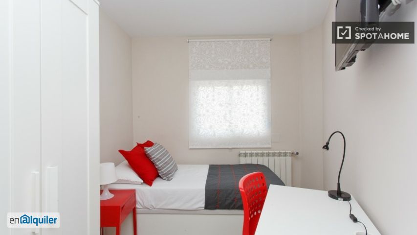 Las habitaciones están disponibles para alquilar en un apartamento de 70 m² y 4 dormitorios en Cuatro Caminos en Madrid. El apartamento es limpio y moderno y está pintado principalmente en blanco, lo que le ayuda a sentirse luminoso y espacioso. Hay mucha luz natural, así como mucho espacio de almacenamiento para sus pertenencias, y cada una de las habitaciones tiene su propio televisor, una gran ventaja y perfecta para relajarse después del trabajo. Cuatro Caminos es un área animada con una mezcla ecléctica de culturas y nacionalidades que crea un ambiente animado y ofrece una amplia gama de tiendas, restaurantes y supermercados que venden comida de todo el mundo. También es un lugar conveniente para vivir con las líneas de metro que conectan el vecindario con el resto de la ciudad.