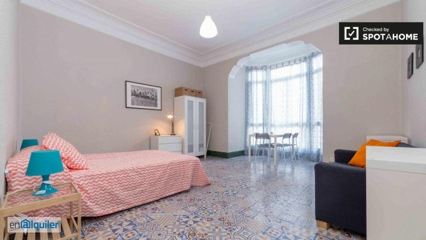 Habitaciones disponibles en alquiler en este piso grande de 6 habitaciones en Gran Vía, en el barrio de l'eixample. El piso es muy luminoso y diáfano, con grandes ventanas en las partes exteriores. Tiene techos altos y está decorado con colores frescos que ayudan a escapar del calor de Valencia. Tendrás acceso a 2 modernos baños con duchas, lavabos y aseos, y también a 1 aseo separado. Además dispondrás de1 cocina moderna y bien equipada con mucho espacio para cocinar y de almacenaje. Gran Vía es una zona repleta de restaurantes y bares, con muchas tiendas, así que comprar las cosas esenciales no supondrá ningún problema. También estarás muy cerca del enorme Jardí del Túria, un precioso parque que cruza serpenteando el centro de la ciudad, y en el que puedes encontrar muchos puntos y lugares de interés, incluyendo el cercano Palau de la Música, un recinto popular de conciertos, cine, arte y exhibiciones, sede de la Orquesta de Valencia.