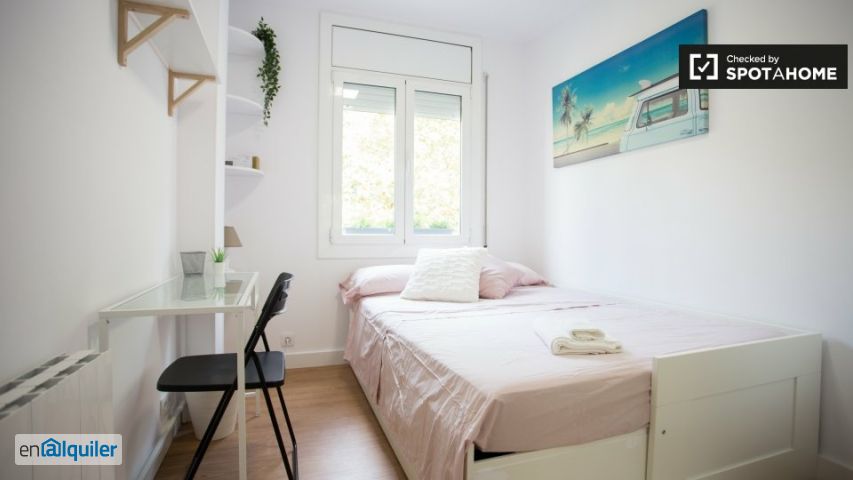 El residencial Barcelona _porque es tranquilo y silencioso_ ¿me gustará aquí? Seguro. Residencial no significa aburrido. Tiene muchas comodidades cerca y está a un corto trayecto en metro del centro de la ciudad. ¿de Verdad? Dime más te encantará el diseño del apartamento, desde el piso de madera hasta el diseño semiabierto. Creemos que el apartamento es perfecto si desea tener fácil acceso al bullicioso centro pero prefiere no vivir en él. Sus 3 razones principales para vivir aquí: - Tienes unidades de aire acondicionado. Confía en nosotros, los querrás en verano. - Nos encanta el diseño de plan semiabierto que hace que las áreas comunes se sientan grandes. - Las habitaciones tienen cómodas camas dobles y reciben mucha luz natural. Pero necesitas saber esto - Solo hay 1 baño para compartir. Su inspector de viviendas, Vanessa, dijo: _ "realmente me encantó esta propiedad. Es una zona muy agradable, residencial, pero también puedes tomar el metro y estar en el centro en solo 5 minutos ”. _ Ayúdame a decidir Este es un segundo piso, apartamento de 4 dormitorios en Carrer d'hartzenbusch, Barcelona. Hay habitaciones dobles soleadas disponibles para alquilar en esta propiedad moderna y elegante. Es perfecto para usted si desea asegurarse de vivir en una propiedad compartida con habitaciones acogedoras y de buen tamaño.