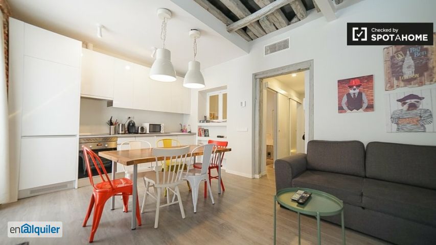 Este espacioso apartamento de 3 habitaciones en Universidad cuenta con calefacción central y está completamente amueblado para su comodidad. La propiedad incluye balcón o terraza, lavadora, secadora y lavavajillas privados para su comodidad. Además, todos los gastos de electricidad, agua, gas y wifi están incluidos en el precio del alquiler, y se proporciona ropa de cama. Se admiten mascotas con algunas restricciones y no se permite fumar. Spotahome ha revisado personalmente este anuncio para garantizar su calidad y fiabilidad. Ubicado en Universidad, Madrid, el apartamento está cerca de numerosos lugares de interés. Cerca se encuentran la Plaza de San Ildefonso, la Joven Caminando, Fotos-Joaquín Sabina y la Estudiante de Malasaña, entre otros lugares importantes. El barrio ofrece lugares de interés cultural y un entorno vibrante, lo que lo convierte en un lugar ideal tanto para profesionales, parejas, familias, estudiantes y estudiantes Erasmus.