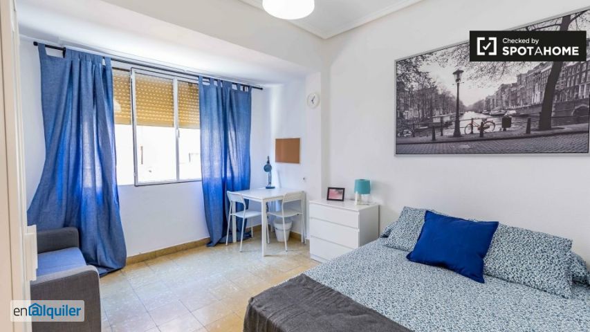 El diseñador de ciudad interior _porque no hay ningún sitio donde prefiera estar_ ¿me gustará aquí? Casi definitivamente. ¿estás buscando algo super central, moderno y con estilo? Asegúrese de quedarse alrededor. ¿de Verdad? Dime más te encantará la pequeña y fresca cocina y el comedor de este apartamento. Disfrute de las comidas en la barra de desayuno, o llévelos al balcón y vea pasar el mundo. Creemos que este apartamento es ideal para los estudiantes que aman la vida urbana. El centro de la ciudad está justo a tus pies, y estás a tiro de piedra del Mercado Central de Valencia. Sus 3 razones principales para vivir aquí: - la cocina y el comedor es lindo y elegante. - el balcón compartido es perfecto para disfrutar de comidas o bebidas. - el centro de la ciudad está justo en su puerta. Pero necesitas saber esto - no hay calefacción ni aire acondicionado instalado en este apartamento. ¡rompe el ventilador portátil para el verano! Y esto - se permite fumar en este apartamento, pero solo en el balcón. - Solo estudiantes, lo siento! Su casa-verificador, José, dijo: _ "me encantó esta propiedad. Está justo en el centro de Valencia, y tiene un pequeño y acogedor balcón con vistas a la calle. "_ Ayúdame a decidirme Este es un hermoso apartamento en el segundo piso, con 5 habitaciones, en Carrer del Triador, Valencia. Disfruta de una cocina soleada con desayunador y azulejos funky, así como de un acogedor balcón para compartir con tus compañeros de piso. Creemos que este apartamento es ideal para todos aquellos que buscan una experiencia vibrante en Valencia. Camina a todos tus lugares favoritos, como el mercado central y la plaza de la Reina.