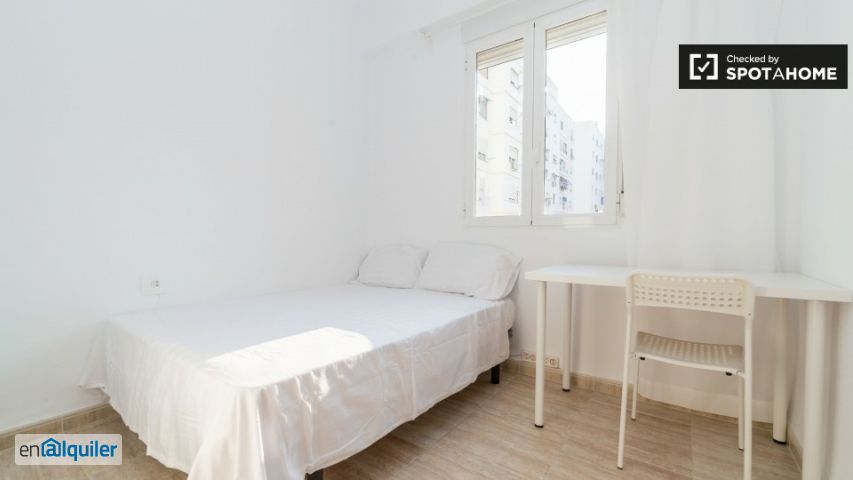 Este 140 m², casa 6 dormitorio tiene habitaciones para alquilar, con muy decoración sencilla y moderna. Todas las habitaciones están equipadas con una cama doble y una tecla individual, que le proporciona una mayor comodidad y privacidad. Hay 2 baños completos para compartir y 1 habitación tiene un cuarto de baño. La sala de estar y cocina comparten un espacio rectangular, con la mesa de comedor en el medio, por lo que es un gran lugar para relajarse con sus compañeros o entretener a los invitados. Con grandes ventanas en cada habitación, paredes blancas y el suelo de madera de color claro, el apartamento es muy luminoso y fresco. El apartamento está situado en el barrio de el Pla del Real. Esta es una gran opción para los estudiantes, a sólo 20 minutos de distancia tanto de la Universidad Politécnica de Valencia y la Universidad de Valencia. El apartamento está en una calle tranquila, pero en cuestión de minutos se llega a la Avenida de Aragón, repleta de tiendas, restaurantes, e incluso un cine. También tiene una parada de metro a sólo 5 minutos de distancia.