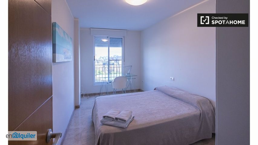 Se alquilan habitaciones en un apartamento amueblado de 2 dormitorios en Carrer de Marie Curie. La propiedad está en el quinto piso de un edificio con ascensor. El establecimiento cuenta con balcón, aire acondicionado, horno, lavavajillas, lavadora y tv. Importante: - Compartirás esta propiedad con el propietario residente (hombre, profesional, 26-30 años). Situado en Valencia, en un barrio animado, perfecto para pasear o hacer ejercicio al aire libre. Fácil acceso al transporte público. Cerca de supermercados, restaurantes y tiendas. El apartamento está completamente amueblado, es acogedor y recibe mucha luz natural, ya que ofrece la mejor vista al Parque de Cabecera.