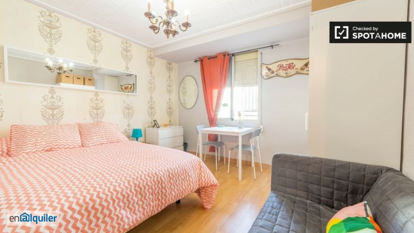 Este piso de 80 m² piso con 4 habitaciones dispone de habitaciones en alquiler con camas individuales y dobles. El piso es bastante espacioso, con 2 largos pasillos. Desde la entrada principal hasta las habitaciones individuales puedes encontrar una decoración y un papel de pared muy alegres y coloridos. La cocina es la principal zona común, con mucho espacio para los compañeros de piso. Hay 1 baño completo para compartir. El piso está situado en el residencial pero animado barrio de Quatre Carreres. El método de transporte más utilizado es el autobús, y estarás a 1 viaje de solo 20 minutos de la estación de metro más próxima. Tendrás muy cerca el famoso Corte Inglés, 1 centro comercial y muchas tiendas de alimentación.