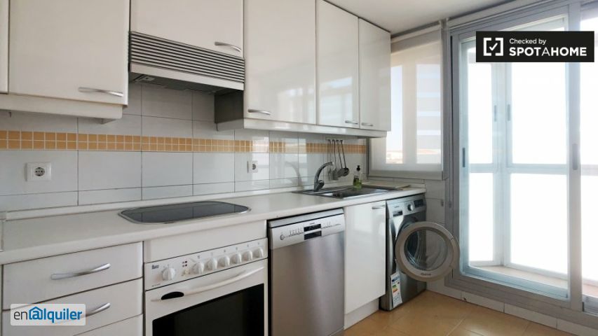 Este apartamento contemporáneo de 2 dormitorios en la calle Grazia Deledda, en Villaverde, es amplio y tiene acceso a balcones desde la sala de estar y los dormitorios. La cocina está totalmente equipada con todo lo que necesita para cocinar, mientras que la sala de estar tiene una bonita mesa de comedor, sofá y tv. El baño moderno ofrece una ducha, mientras que cada habitación tiene un montón de espacio de almacenamiento, uno con una cama doble y baño, y el otro solo. Vivir en este encantador apartamento estará ubicado en una agradable zona residencial al sur del centro de la ciudad de Madrid, en un barrio bien comunicado. Podrá acceder al centro de la ciudad en menos de una hora o disfrutar de este lugar y de todo lo que ofrece desde los diversos restaurantes y bares hasta el gran centro comercial. Tendrás una tienda de comestibles al final de la calle y muchos parques cerca.