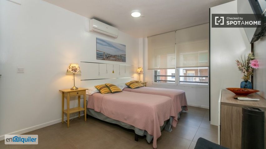 Le traduzioni automatiche sono realizzate con Google Translate: può darsi che non siano sempre corrette. Bienvenido a este precioso estudio ubicado en el barrio de Mont-Olivet, Valencia. Este apartamento se entrega completamente amueblado y cuenta con aire acondicionado central, cocina equipada con horno y tv. Además, todos los gastos (luz, agua, gas y wifi) están incluidos en el alquiler. Está disponible para trabajadores y estudiantes de posgrado, y se admiten mascotas con ciertas restricciones. El apartamento ha sido revisado por Spotahome, lo que garantiza su calidad. Mont-Olivet es un excelente lugar para vivir, con fácil acceso a diversas atracciones, restaurantes y servicios. Cerca de esta propiedad, encontrará el Rey Döner Kebab, Las Delicias y Papa John's. Entre las atracciones turísticas cercanas se incluyen Falla Avinguda Regne de València-Duc de Calàbria, Veneno Concept y Arte Urbano-Barrio de Mont-Olivet. El barrio es vibrante y está bien conectado, lo que lo hace ideal para la vida urbana.