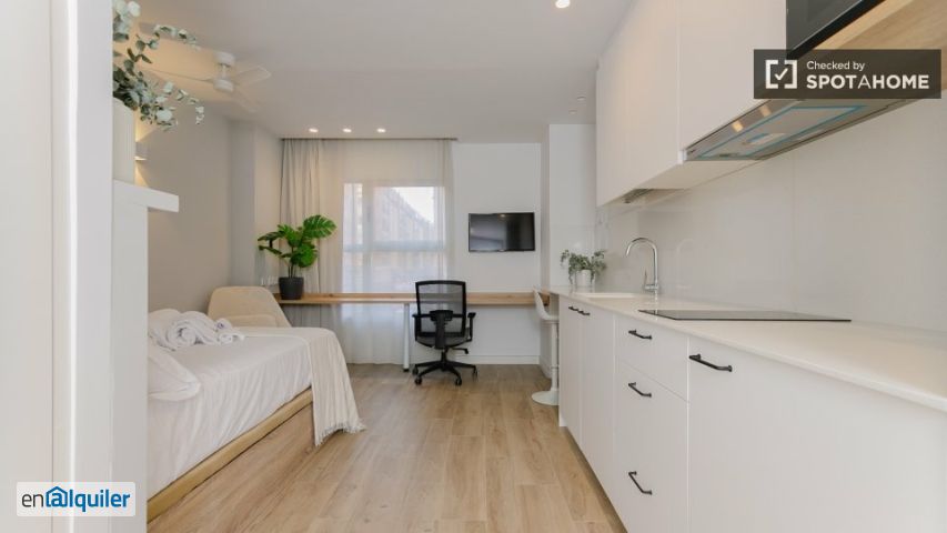 Este estudio exterior, ubicado en Torrefiel, Valencia, ofrece una experiencia de vida moderna. Cuenta con cocina totalmente equipada, aire acondicionado central, ascensor y está amueblado para su comodidad. Los servicios, como electricidad, agua y wifi, están cubiertos dentro de los límites globales. El espacio ha sido revisado profesionalmente por Spotahome y es ideal para estudiantes y profesionales. Torrefiel es un barrio animado de Valencia. Entre los servicios cercanos se incluye una amplia variedad de opciones gastronómicas, como Arrocería Los Arces y Criollovlc. Otras opciones incluyen Domino's Pizza p. Aleixandre, Bingo Torrefiel y Los Amigos. Encontrará restaurantes como Pechugones Chicken Broaster Orriols y la Tropicana Bar & Restaurant, que aportan diversidad culinaria. Torrefiel ofrece un ambiente agradable para sus residentes.