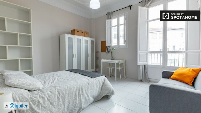 The Bright 6-bed with Balconies Galore _porque uno no es suficiente. _ ¿me gustará aquí? Muy probable. Porque es super moderno y ligero. Porque casi todas las seis habitaciones tienen su propio balcón. Y porque está en un barrio fresco y bullicioso. ¿de Verdad? Dime más te encantará ir directamente desde tu habitación a tu balcón para contemplar el día que viene. Creemos que esta es una gran opción para cualquiera que quiera vivir con otros y hacer nuevos amigos. Y por un barrio que se siente real y auténtico. Sus 3 razones principales para alquilar este apartamento: - Todas las habitaciones son luminosas y acogedoras, con mucho espacio de almacenaje: estar ordenado nunca fue tan fácil. - Las paredes blancas y mucha luz natural significan que este lugar no se siente en absoluto como una casa de estudiantes sucia. - Una lavadora es un verdadero beneficio si necesita motivación para limpiar su ropa. Pero necesitas saber esto - Solo 1 baño entre 6 habitaciones no es ideal. Tal vez hacer un rota? Y esto - no fumar ni mascotas - lo siento! Nuestro Homechecker, José Manuel, dijo: _ “está muy cerca del centro y está bien conectado por autobús y metro. "_ Dame esto directamente Este es un luminoso y moderno apartamento de 4 dormitorios y 4 pisos en Carrer de l'almirall Cadarso en Valencia. Cuenta con múltiples balcones y la ventaja de una lavadora. Esta es una propiedad ideal para estudiantes o profesionales que buscan vivir con otras personas y hacer nuevos amigos en la ciudad. Pero también tienen su propio espacio cuando lo necesitan.