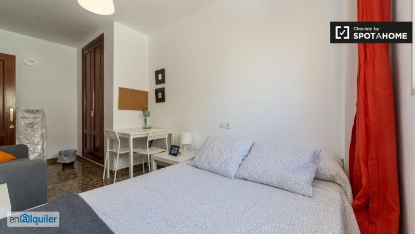 Este apartamento de 5 dormitorios cuenta con habitaciones amplias y bien amuebladas. El espacio común incluye una cocina y 2 baños. La cocina es espaciosa y está totalmente equipada junto con una mesa de comedor. Dado que el apartamento está en el 4 ° piso, hay mucha luz natural que entra por las ventanas desde todos los lados. El apartamento está ubicado en una zona muy céntrica y turística. Las visitas obligadas son: Jardí del Túria, que se encuentra a solo 10 minutos a pie. El hermoso monumento arquitectónico de Valencia: el centro acuático, también se encuentra a solo 10 minutos de distancia. Aquí puede encontrar museos, un centro acuático con una colección de peces del mar Mediterráneo y un hermoso restaurante. El apartamento también está cerca de la Universidad de Valencia, ya que se encuentra a solo 25 minutos en autobús y a 10 minutos en coche.