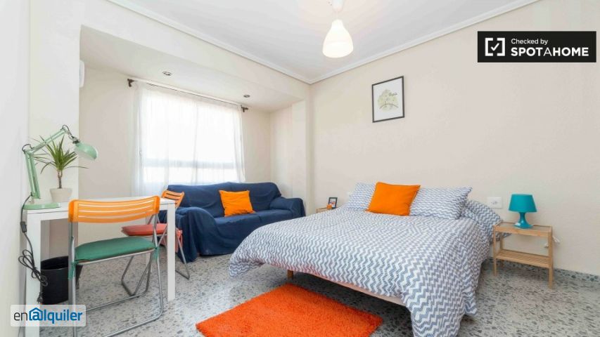 Las habitaciones están disponibles para alquilar en un apartamento de 5 dormitorios en Algirós, cerca de las universidades. El apartamento tiene una decoración agradable y funcional, y tiene un balcón que es accesible desde uno de los dormitorios. Hay una zona de cocina comedor compartida que está equipado con todo lo necesario, un cuarto de baño con ducha a ras de suelo, y una sala de aseo. Algirós es muy popular entre los estudiantes, ya que está cerca de la Universidad Politécnica de Valencia y el campus de Tarongers de la Universitat de València. Hay un montón de tiendas, bares y restaurantes para mantenerte entretenido, y hay una conexión directa de metro en el centro de la ciudad.