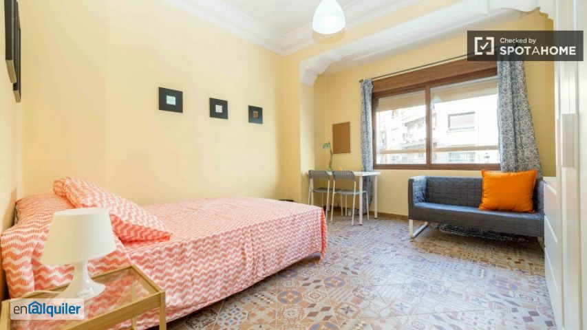 Las habitaciones están disponibles para alquilar en un piso de 5 dormitorios en el barrio de Russafa de Valencia vibrante. La propiedad está decorada en un estilo contemporáneo y tiene una gran cocina con comedor, un pasillo con un sofá, y 5 habitaciones, algunas de ellas con balcón. Russafa está convirtiendo rápidamente en el barrio más deseable de Valencia. Es muy céntrico, lleno de bares, restaurantes y tiendas, y tiene una gran vida nocturna. El apartamento está a pocos pasos de Mercado de Russafa y está a poca distancia de la Estación del Norte y el resto del centro de la ciudad.