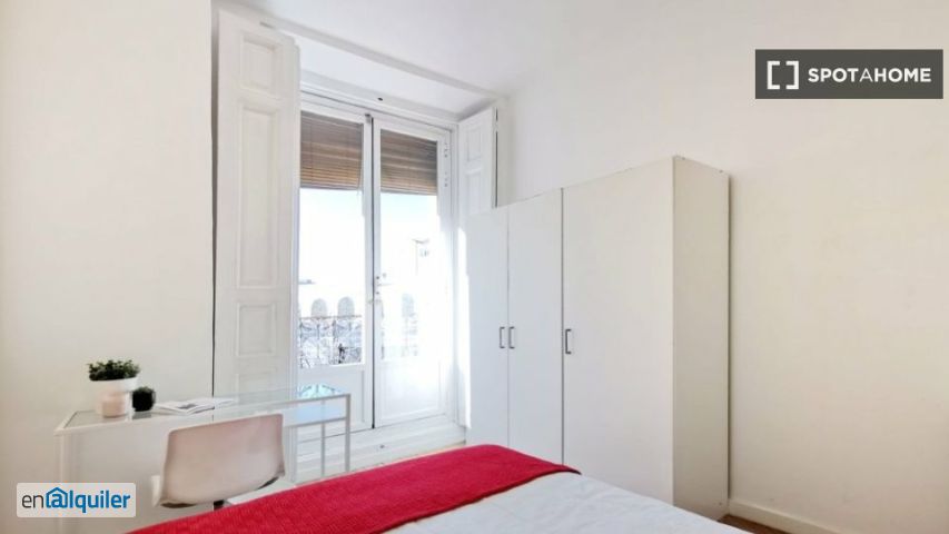 Hay habitaciones luminosas y coloridas disponibles para alquilar en este espacioso 160 m², apartamento 9-dormitorios cerca del centro de la ciudad. El apartamento tiene suelos de madera y paredes de colores cálidos, proporcionando un ambiente acogedor. Las principales áreas comunes incluyen la sala de estar comedor y la cocina totalmente equipada. También hay 2 baños completos para compartir. El apartamento está situado en el animado barrio de la Latina, conocida por su alto número de deliciosos bares de tapas. El apartamento está en el corazón de este barrio con todos los servicios y comodidades a poca distancia. Usted también tiene el famoso mercado del Rastro cercano, que tiene lugar cada domingo por la mañana.